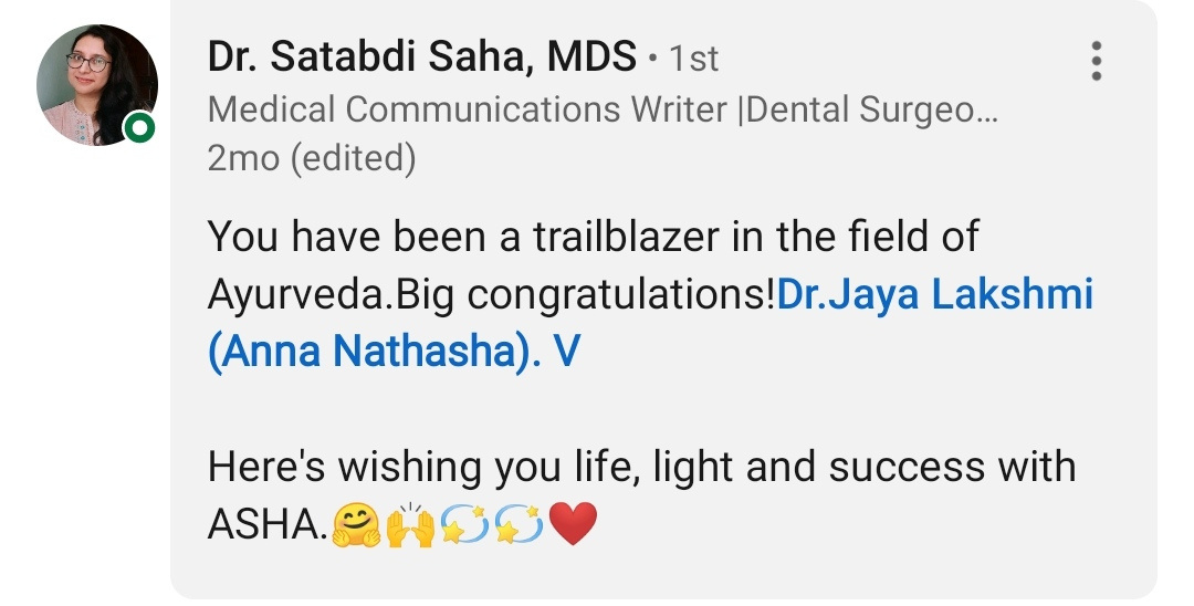 Jaya has been sharing very informative and authentic content in wellness through Ayurveda as this has always been a helpful tool to all of us here in enlightening our knowledge and sharing with others too. Her new venture under Asha speaks itself and ensures a ray of light hope to revive back through right use of Ayurveda content shared by her for the seekers. I sincerely wish for her success in this new endeavour. Congratulations